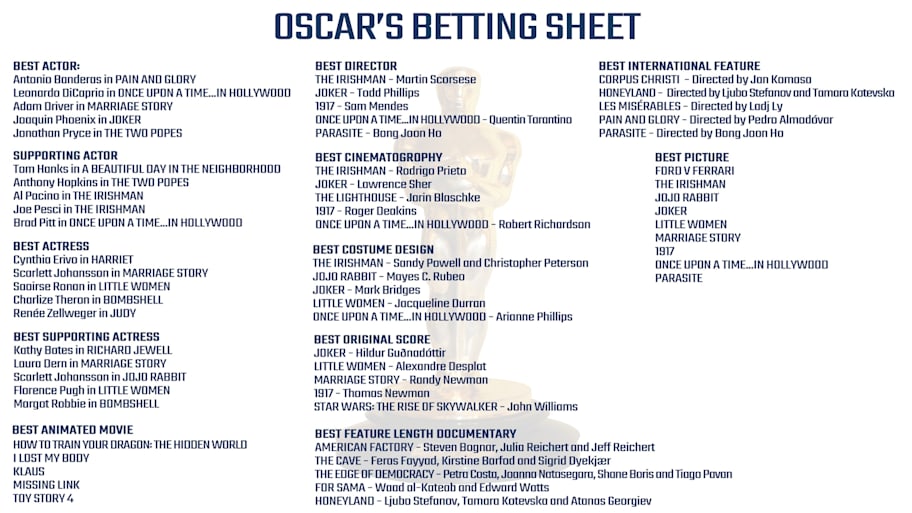 Oscars 2020 Betting Tips Predictions Odds Favourites